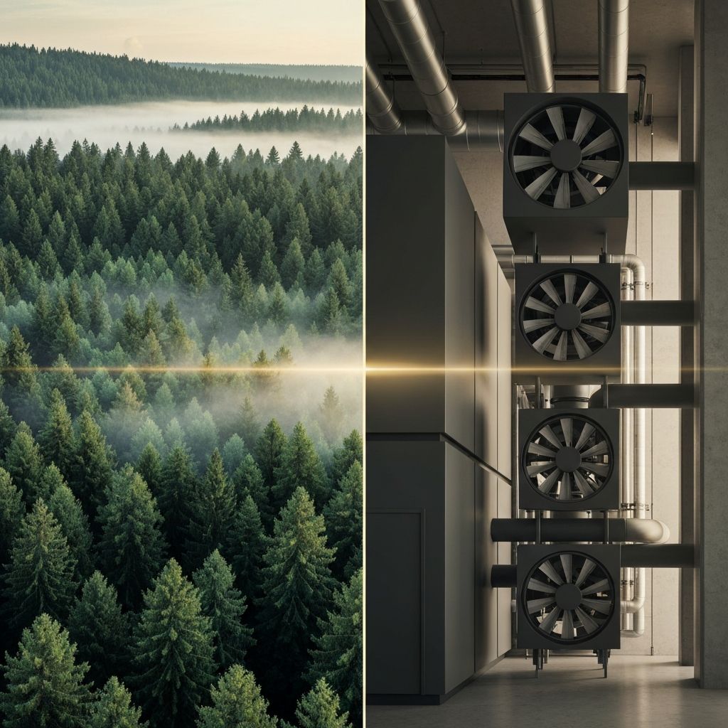 - Direct air capture with geological storage (DAC+S) — industrial-scale fans and chemical solvents pulling CO₂ from ambient air, then injecting it into deep saline aquifers. Permanence of tens of thousands of years. The gold standard — and the most expensive.